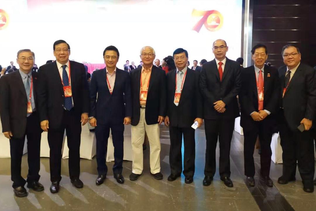 中总代表受邀在出席新中国成立70周年报告会上与同样来自马来西亚的代表合影。左2起为拿督斯里祝友成、丹斯里戴良业、拿督林国璋局绅、拿督陈英强、拿督吴逸平及拿督黄国辉