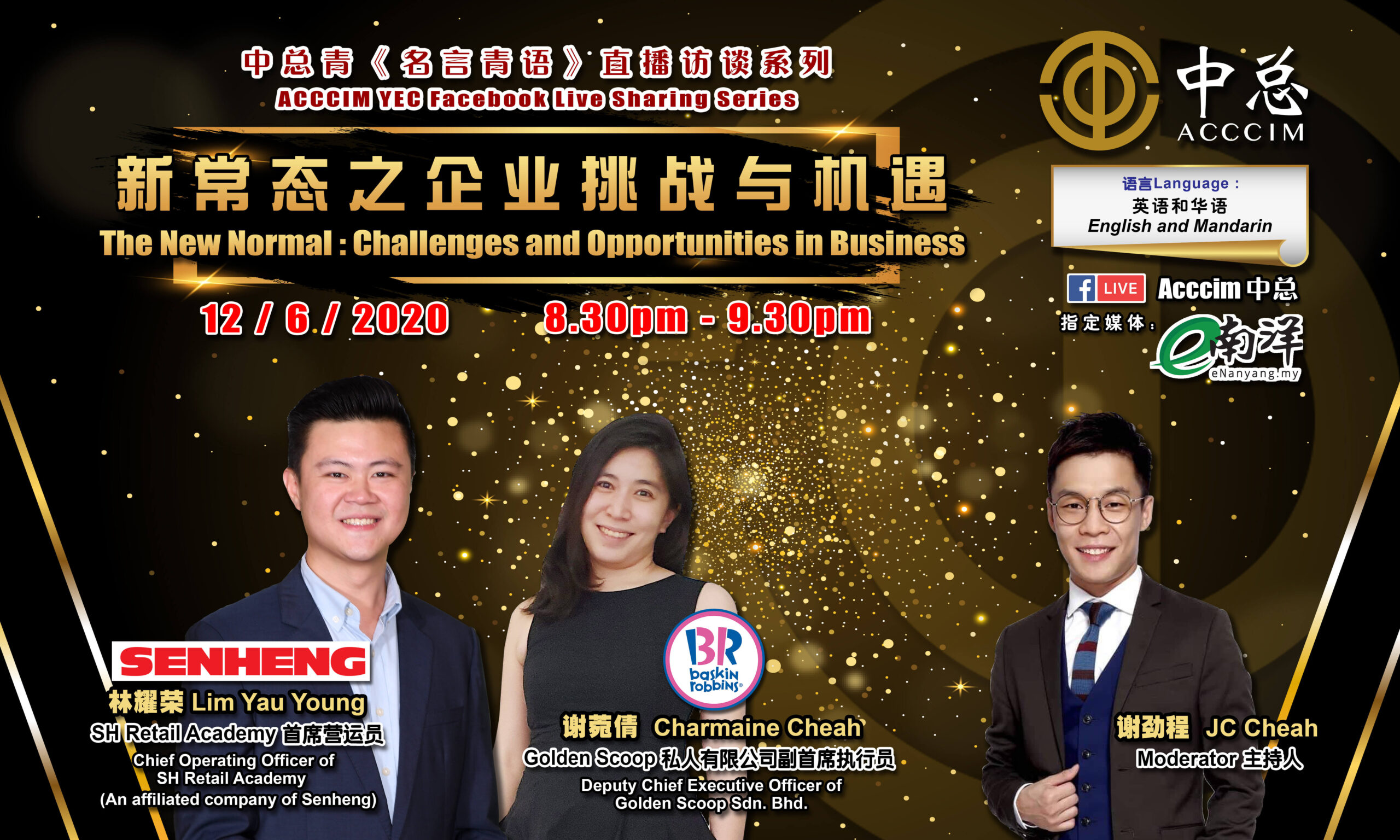首场直播访谈节目将在2020年6月12日晚上8时30分,在中总官方脸书开播,邀请了SH Retail Academy首席营运员林耀荣先生及Golden Scoop私人有限公司副首席执行员谢菀倩小姐,分享新常态之企业挑战与机遇。